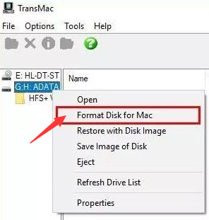 2.打开TransMac ,插入U盘,在软件中右键U盘,在弹出的菜单中选择 Format Disk for Mac (将磁格式化为 Mac 格式) ;然后提示输入卷标名、还有格式化类型,这里不要动选择,选择默认的 Mac OS Extended HSF+ 就可以了。