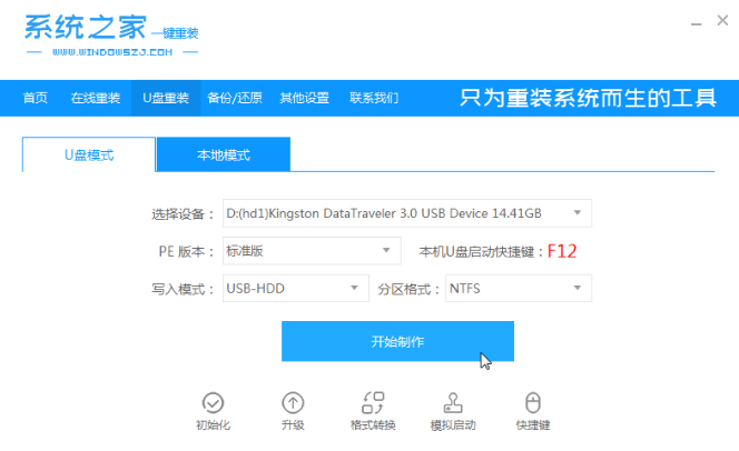 1.在一台可用的电脑上下载安装系统之家一键重装系统工具,关闭电脑的杀毒软件,插入一个8g以上的空白u盘,选择u盘模式开始制作。