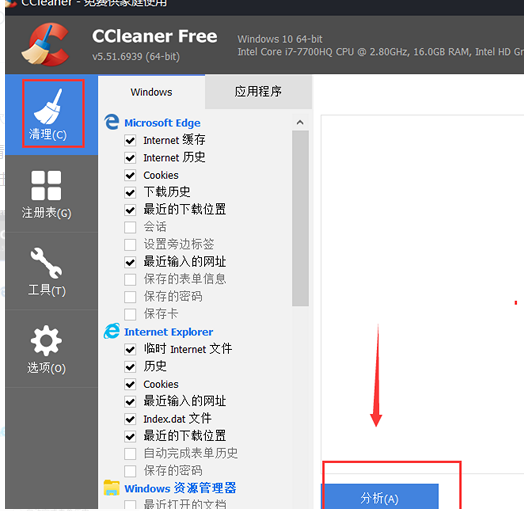 1.你可以使用ccleaner软件来清除垃圾文件,首先打开软件,选择清除选项,然后选择"windows"进行垃圾清理,在默认情况下点击分析文件: