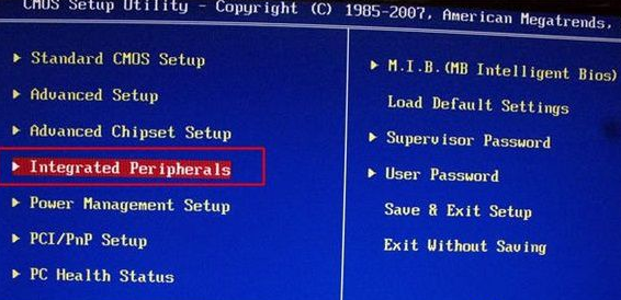 一、电脑启动,当启动画面出现时,不断按BIOS快捷键进入BIOS设置界面,选择IntegratedPeripherals并回车。