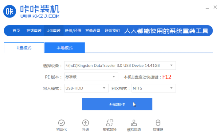 1.先下载安装咔咔装机一键重装系统工具,打开、插入8g以上空白u盘,选择u盘重装系统模式,点击开始制作。