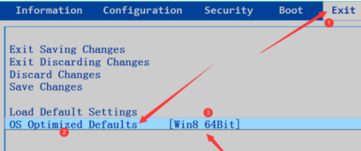 1、重启电脑,不断按DEL或F2进入BIOS,到EXIT把OS optimized Defaults 里默认[Win8 64bit]改成[Other OS] 。(不同的电脑主板启动快捷键不同,大家可以自行查询)