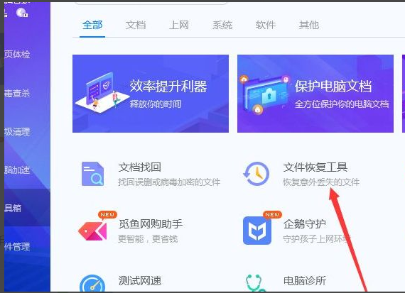 1、打开电脑管家,点击工具箱,下滑找到并点击文件恢复工具。