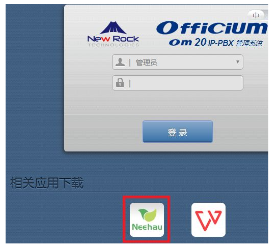 1、打开IP-PBX的登录界面,点击下方的“侬好”图标,下载完成后进行安装。(以OM20为例进行说明)