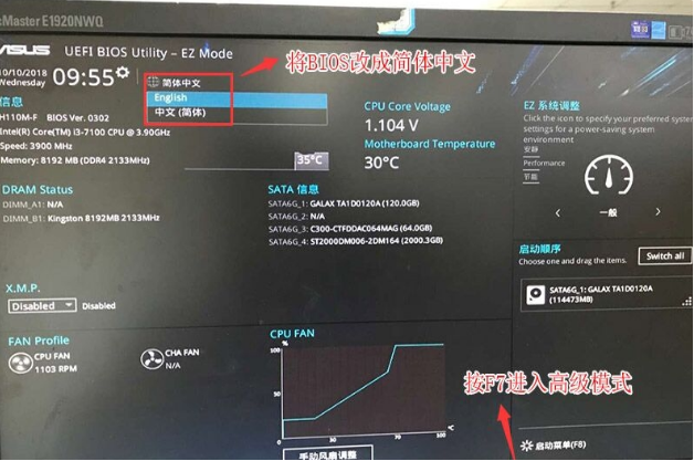 1、重启华硕电脑按esc或f8进入BIOS设置,将bios改成简体中文,然后按F7进入高级模式,如下图所示;