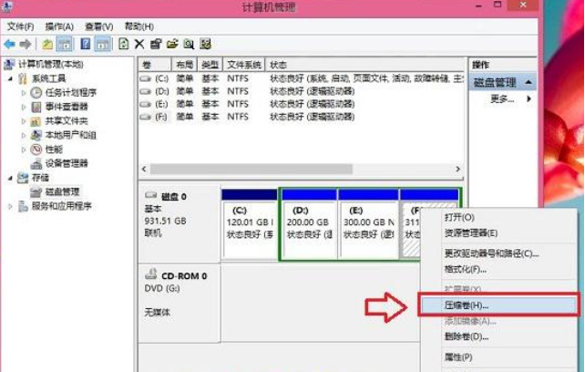 1、我们进入到“计算机管理”,然后选择“磁盘管理”,找到一个剩余空间较大的分区,右键选择“压缩卷”。