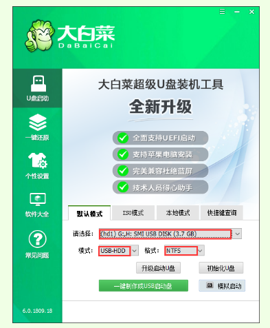 1、下载并安装好大白菜装机版,打开软件并插入U盘,选择“默认模式”,点击需要制作启动的设备,在模式选项中选择“USB-HDD”,格式选择“NTFS”