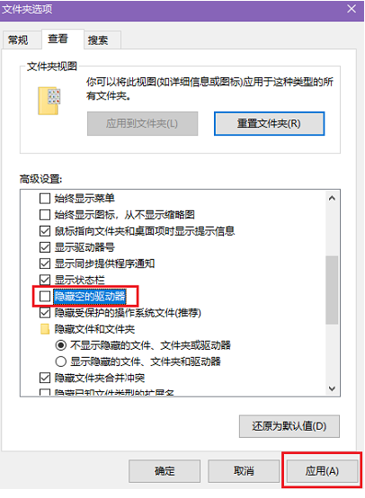 1.当u盘不显示盘符时,我们打开我的电脑中文件夹选项,切换到“查看”选项卡下,在高级设置框中找到并取消勾选“隐藏空的驱动器”项,然后点击“应用”选项。