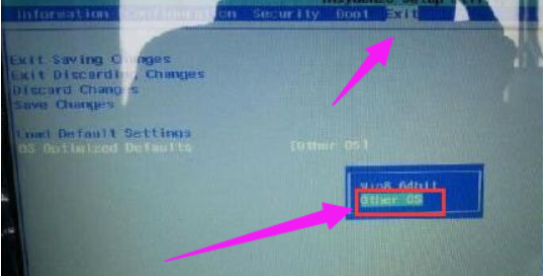 1、我们按开机键,等待开机画面出现时按f2进入bios,点击【Exit】,把【OS optimized Defaults】里默认的Win8 64bit改成【Other OS】。