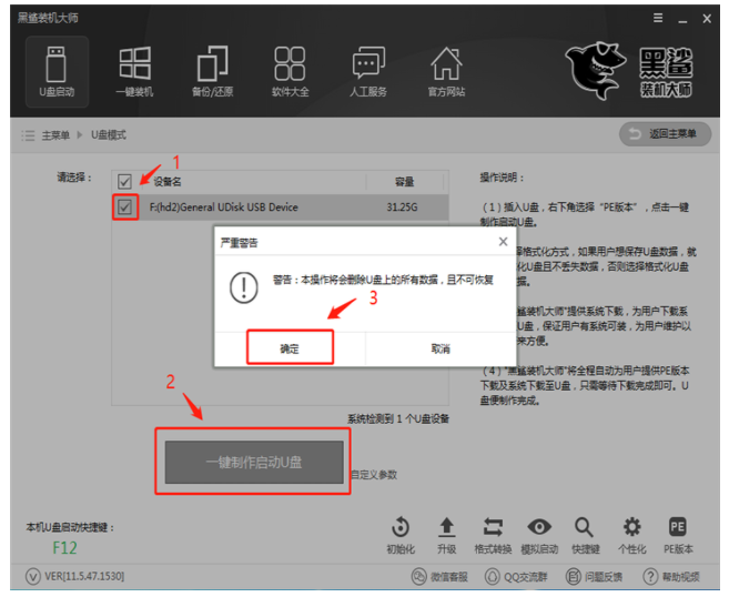 2、然后按图标顺序操作,勾选你的U盘点击一键制作启动U盘,此时会弹出格式化U盘的警告,我们保证文件已备份的情况下,点击“确定”即可。