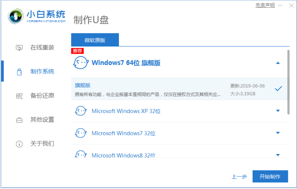 2、进入系统选择界面,选择需要安装的系统,点击“开始制作”。