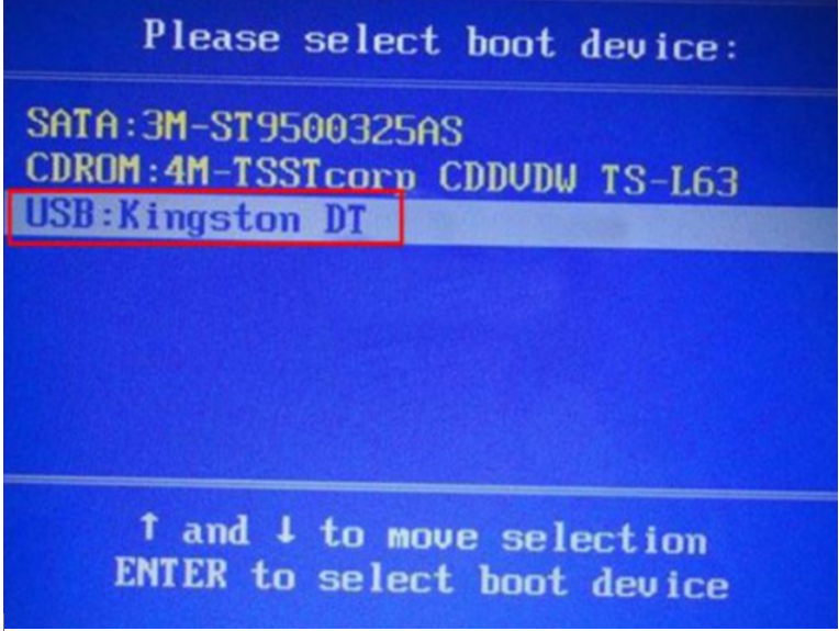 2、将制作好的大白菜启动u盘插入电脑USB接口,开机或重新启动,按下U盘启动快捷键进入优先启动项设置界,选择U盘选项(一般为带USB的选项),按Enter键进入;