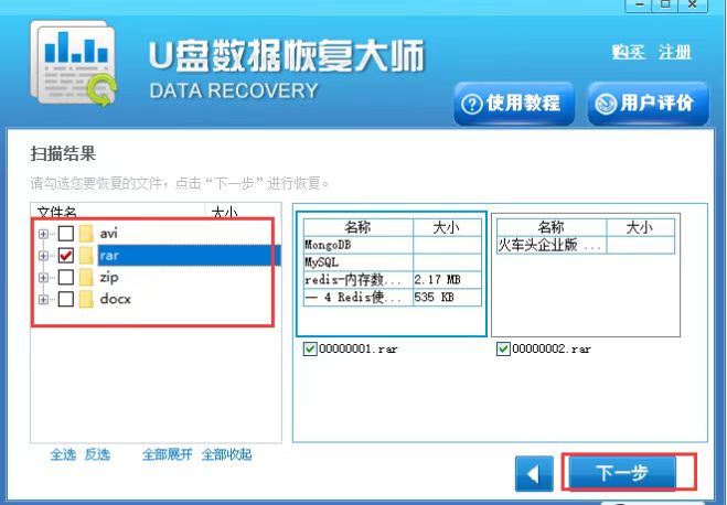 6、等待U盘数据恢复大师免费版扫描完成后,就可以出现下图中的界面,我们在界面的左侧可以看到删除的文件,然后我们选中要恢复的数据,在点击界面下方的下一步。