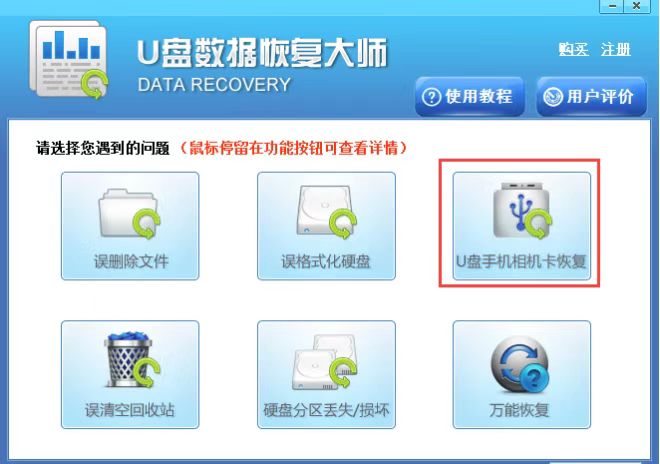 2、然后安装好后打开,在桌面找到软件的快捷方式双击打开进入到下图中的主界面,可以看到界面有多种功能选项,我们点击“U盘手机相机卡恢复”选项,进入下一步。
