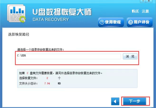 7、进入到选择恢复路径界面,这里我们需要选择一个目录来存放恢复的文件,这里需要注意的是如果你之前的数据在C盘或者D盘,那么选择恢复的目录最好选择其他位置,避免数据覆盖,接下来我们点击下一步就可以开始恢复你需要的数据了,我们等待回复完成后就可以在设置的存放目录中找到了。