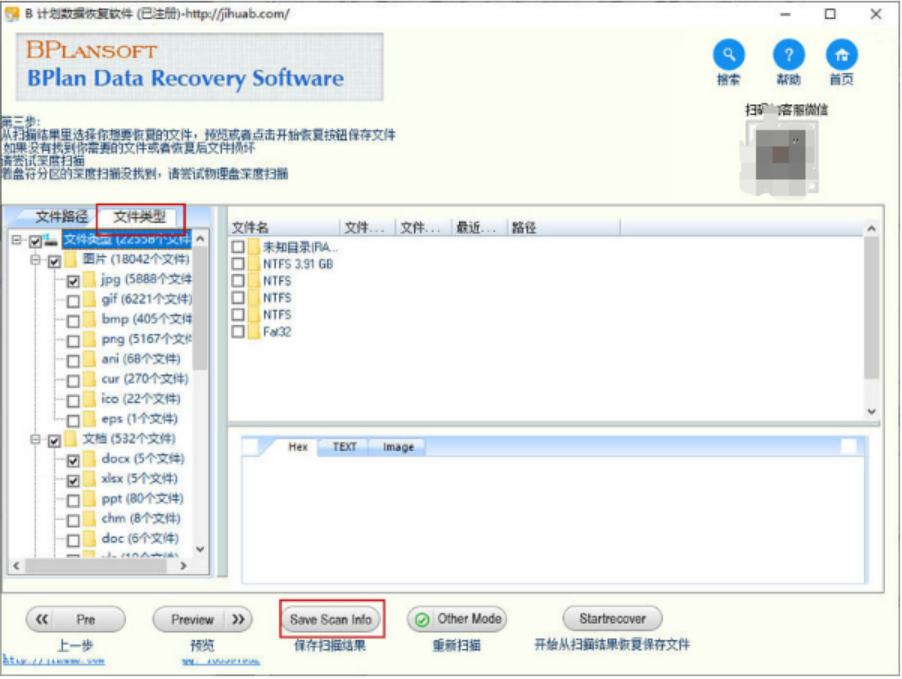 6、完成保存扫描信息后,点击“文件类型”。选择文件类型可以快速找回需要的数据,节省更多时间。然后点击“开始恢复”按钮。