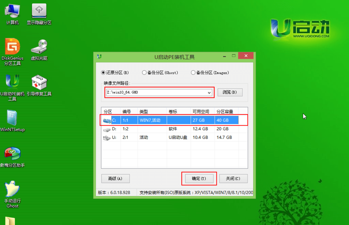 第四步:映像文件添加成功后,我们只需在分区列表中选择C盘作为系统盘,然后点击“确定”即可,如下图所示: