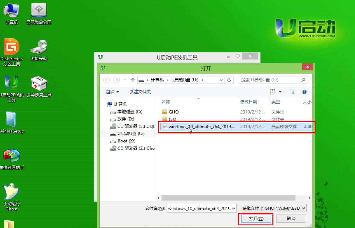 第三步:接着找到并选中u盘启动盘中的win10系统iso镜像文件,点击“打开”即可,如下图所示: