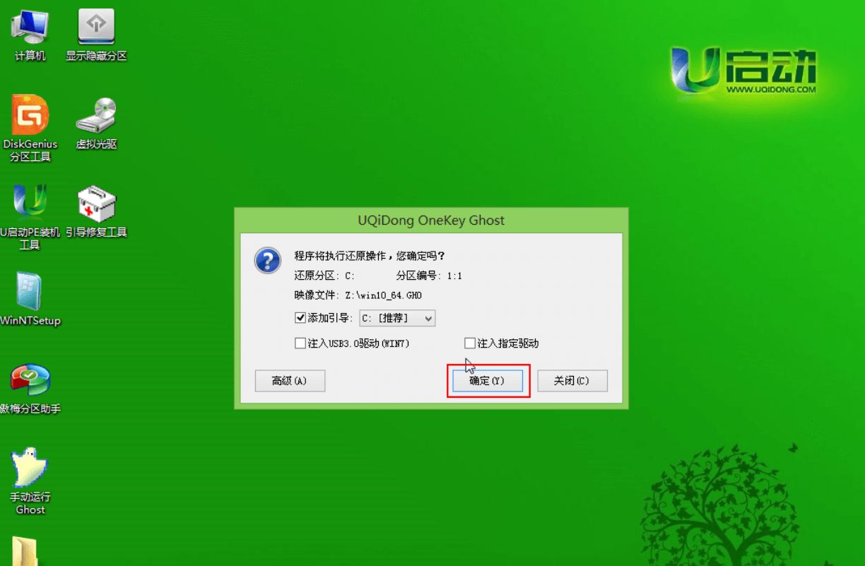 第五步:随后会弹出一个询问框,提示用户即将开始安装系统。确认还原分区和映像文件无误后,点击“确定”,如下图所示: