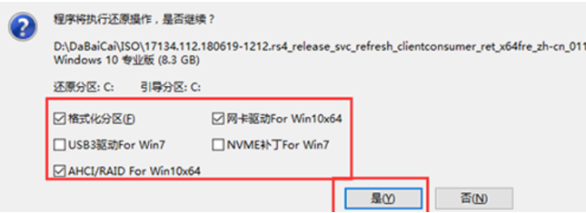 11、会跳出一个关于还原设置的弹窗,选择【是】。(PS:建议网卡驱动与USB驱动都勾选,以免重装系统之后出现无法正常上网以及USB无法识别的情况。)