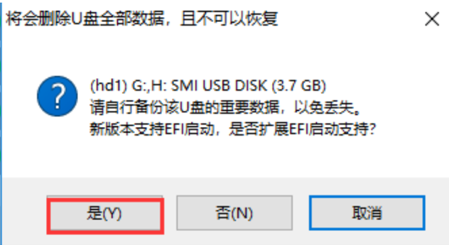 4、在点击一键制作后会弹出一个关于【U盘数据删除且不可恢复】的窗口,选择【是】。