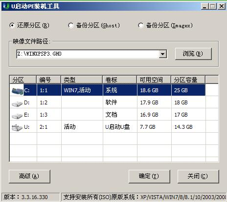进入pe系统u启动pe装机工具会自动开启并识别u盘中所准备的xp系统镜像,可参照下图的方式进行选择,操作完成后点击“确定”即可:
