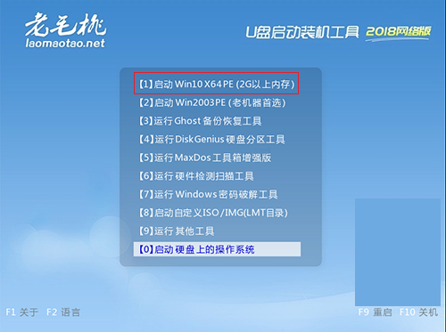 第三步 进入老毛桃winpe主菜单后,通过“↑↓”键选择“【1】启动Win10 X64PE(2G以上内存)”后回车进入。