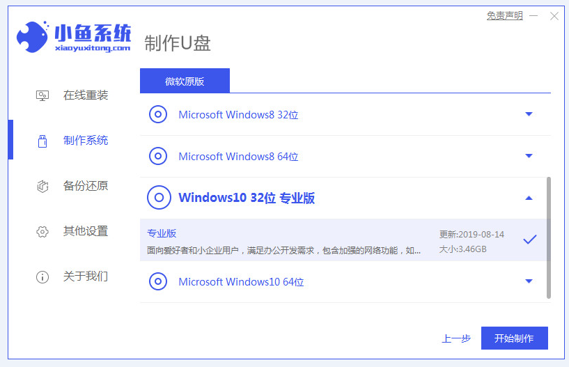 2、选择需要安装的系统,选定后点击开始制作。