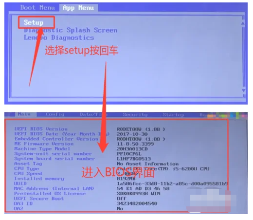 1、重启电脑,出现开机启动页面时按下启动快捷键,显示如下页面时,按住Tab键切换到App Menu页面,再选中Setup即可进入BIOS界面。