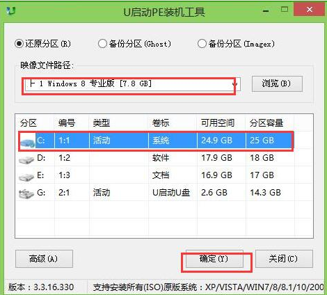 2、在pe系统中,u启动pe装机工具会自动开启,识别u盘中所准备的原版win8系统镜像,分区选择C盘,点击确定。