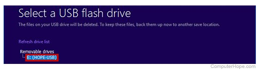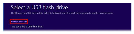 6、系统将要求您选择 USB 闪存驱动器。如果您的 USB 闪存驱动器未插入,请立即插入,稍等片刻,然后单击刷新驱动器列表。