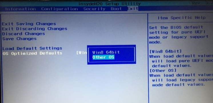 2、来到bios设置之后,按方向键移动到Exit,选择OS Optimized Defaults回车,选择Other OS回车。