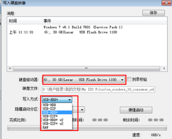 4.当我们选择u盘之后,写入方式选择“USB-HDD+”,点击写入就可以啦。