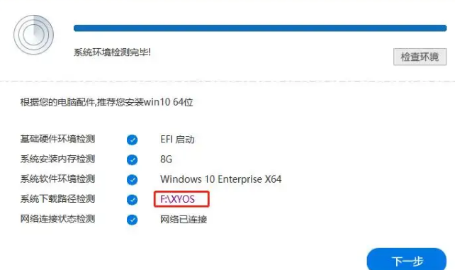 把U盘插入组装的主机中,打开电脑,进行环境检测,检测完毕,重启就可以了。