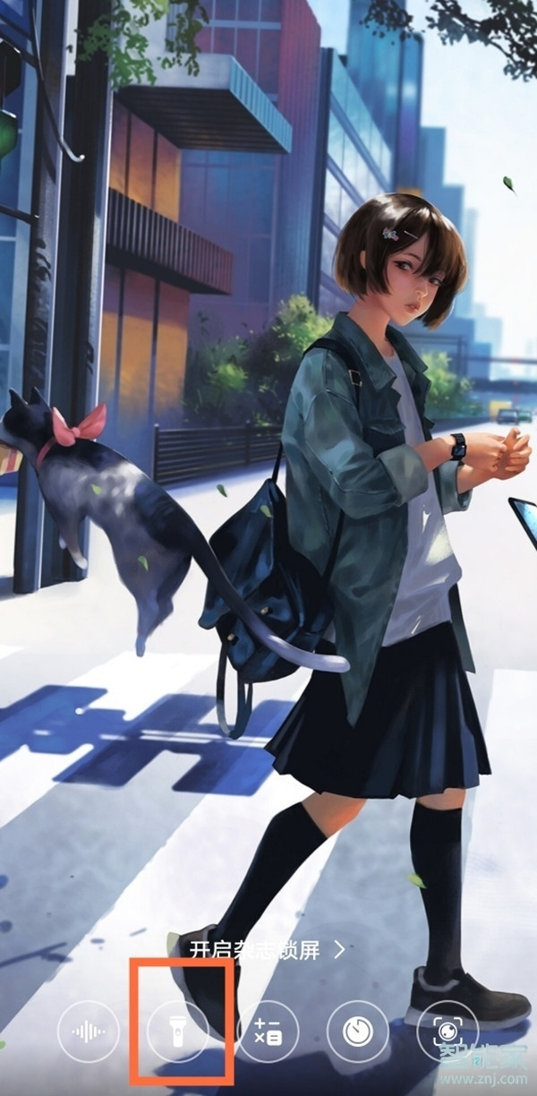 2、锁屏界面,从屏幕底部边缘向上滑动,打开锁屏快捷操作面板,点击“手电筒”图标,即可打开/关闭手电筒。