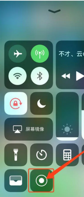 5.上滑,呼出快捷控制页面,点击如图所示按钮,能开始录屏(这时候录屏没有声音),如果想开启声音,长按如图所示按钮