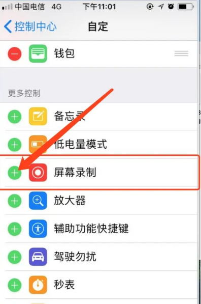 3.进入自定控制页面后,找到屏幕录制,点击加号