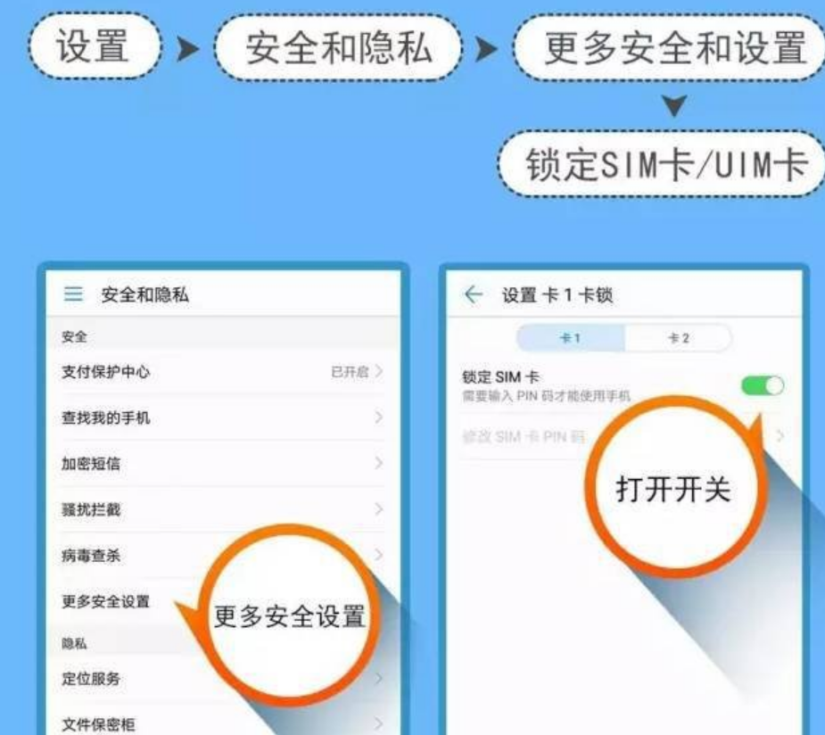 1、 安卓手机,进入设置--安全和隐私--更多安全和设置--锁定SIM卡/UIM卡,如下图所示: