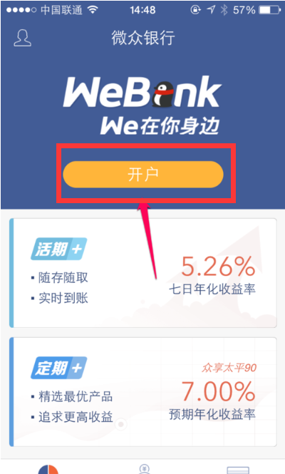 1、首先自动去微众银行APP,在手机打开微众银行,点击开户。