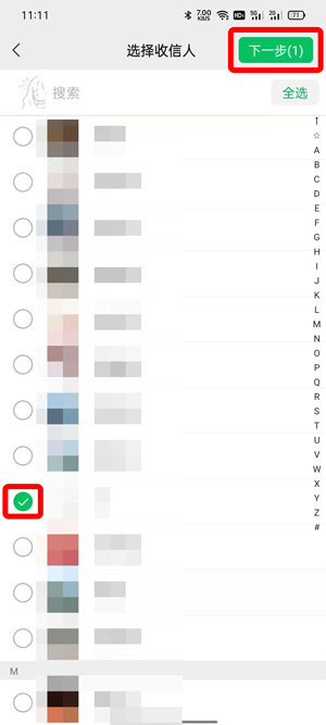 4、在弹出的页面中勾选需要群发消息的好友,点击右上角的【下一步】;