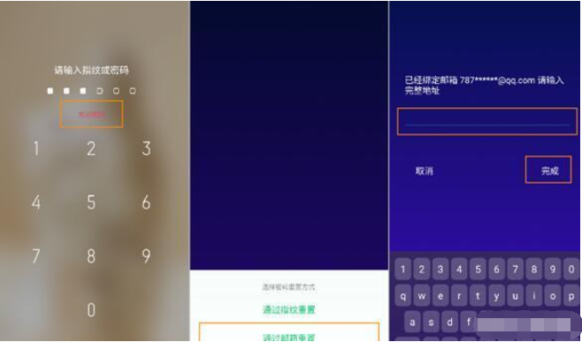 首先启动手机点亮屏幕,然后连续输入五次密码就会显示密码错误。我们点击忘记密码,选择通过验证邮箱/指纹重置密码,根据提示输入正确验证信息后重新设置密码即可。