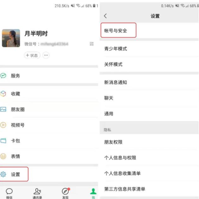 1、打开微信,点击右下角的【我】,进入【设置】-【账号与安全】。