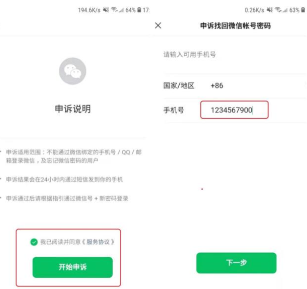 2、点击【开始申诉】,填写自己的手机号,或者是家人、朋友的手机号也行。