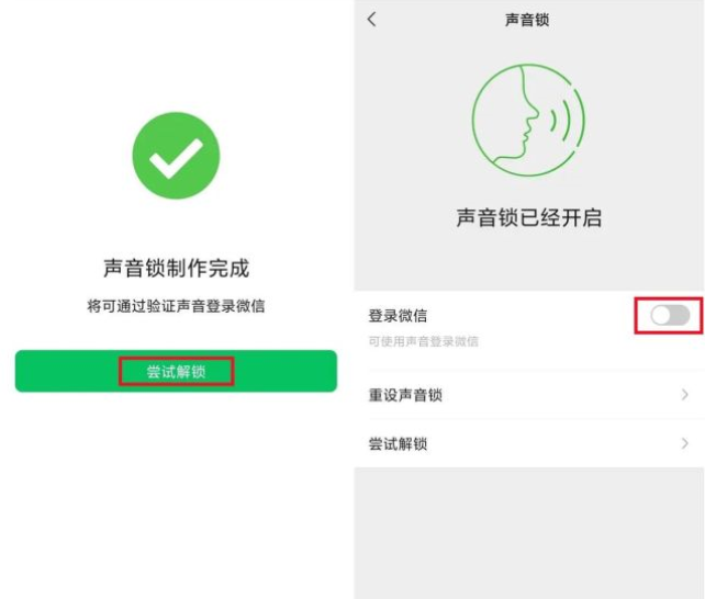 4、声音锁制作好后,开启【登录微信】功能,以后用语音登录。