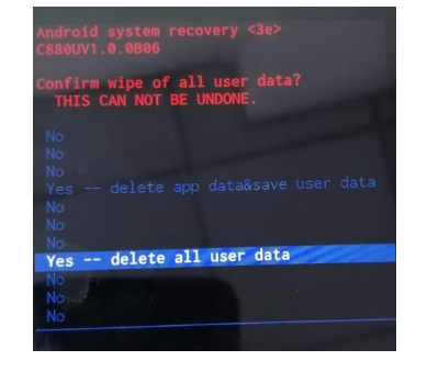 5、选择选项删除所有用户数据,然后按电源按钮确认。