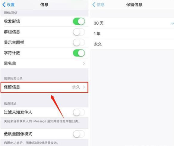 在苹果的设置界面,点击【信息】进入,找到【保留信息】选项,根据个人的需要进行信息的清除的设置。
