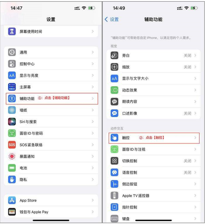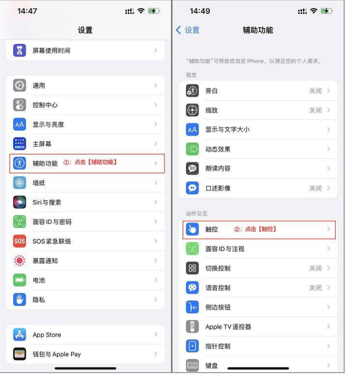 1、首先打开苹果手机中的“设置”,找到“辅助功能”后单击“触控”。