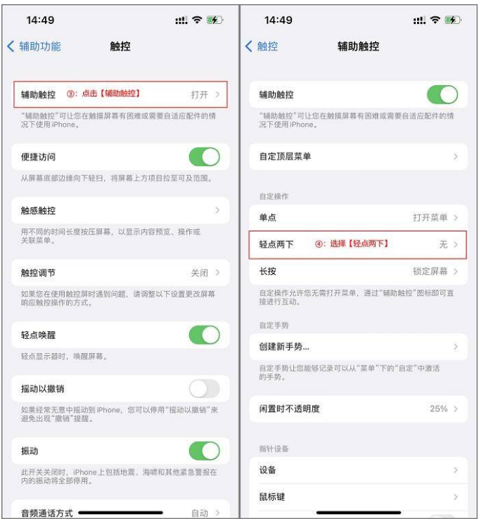 2、在“触控”中把“辅助触控”打开,在“轻点两下”。