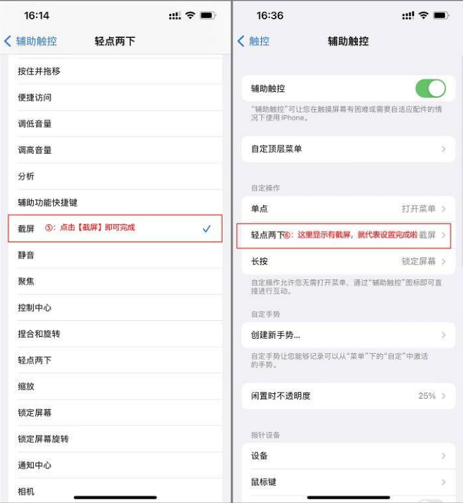 3、找到“截屏”并勾选,返回,看到“轻点两下”的按钮中出现了“截屏”则表示设置完成啦,以后我们只需要轻点两下就可以截图。
