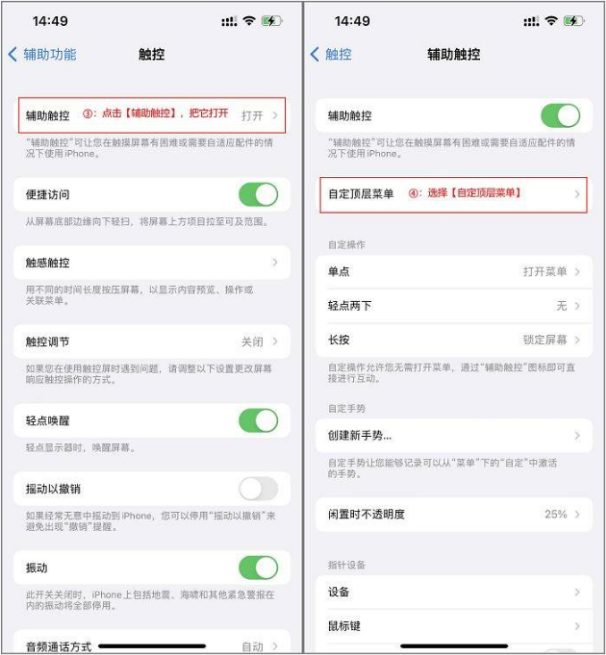 2、再把“辅助触控”按钮打开,单击“自定顶层菜单”即可。